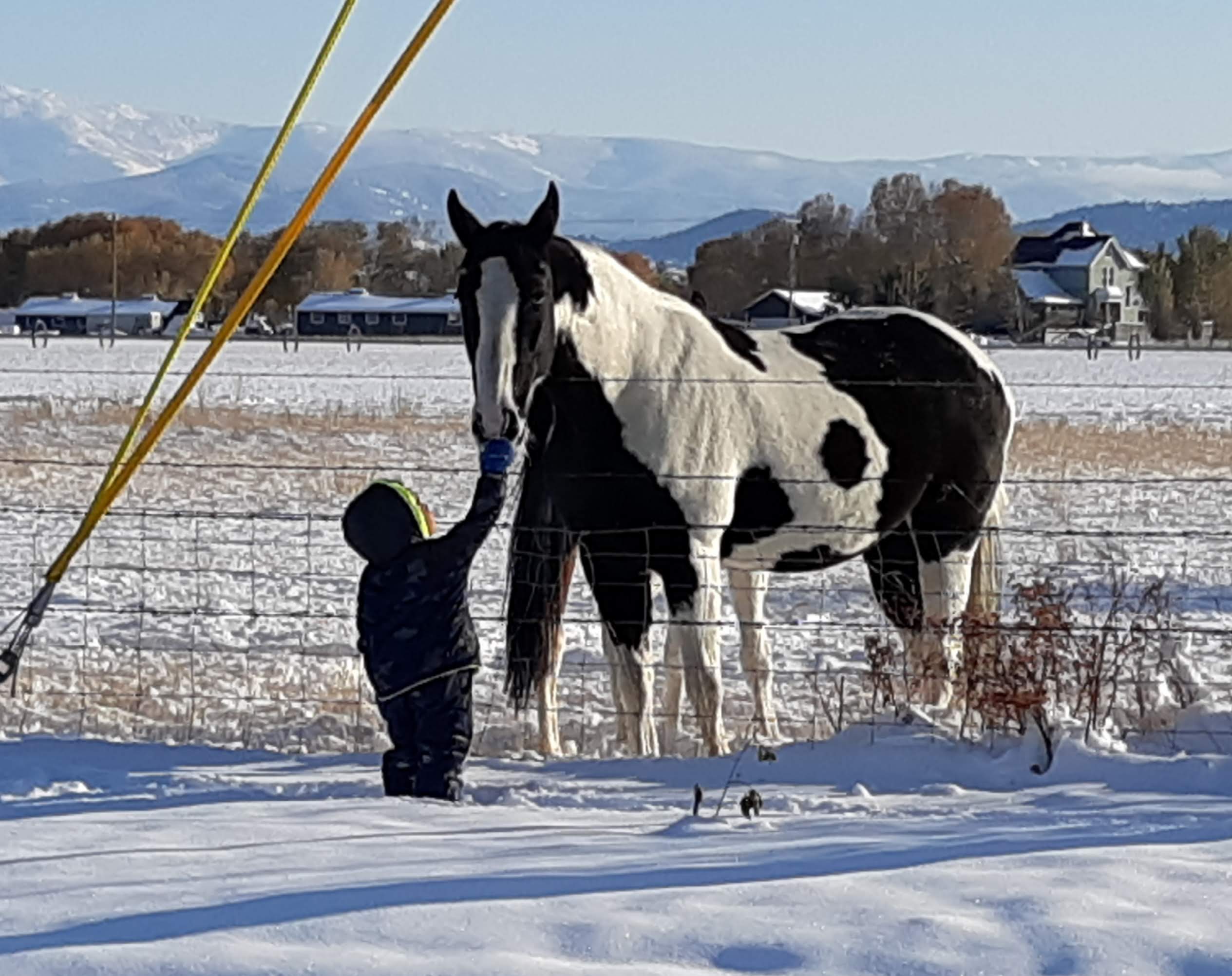 The neighbor's horses come up to the fence right next to their driveway. Benny always goes right over to see them.